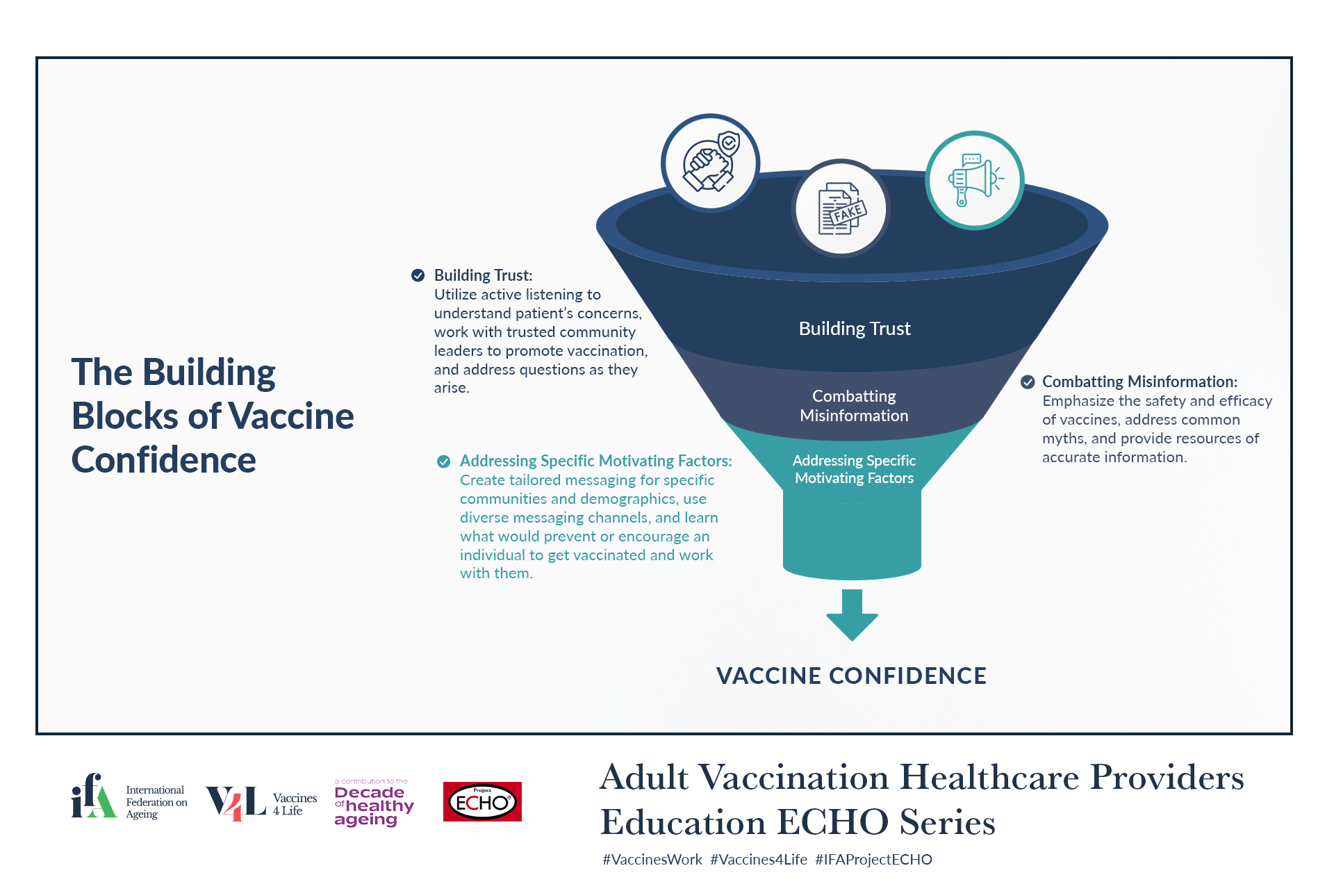 The recent AV-HCP ECHO program has proven successful in improving knowledge, skills, and capacity of HCPs that work within the field of healthy ageing. The technical report on this series details its purpose and impact and provides key recommendations, which can help guide HCPs around the world in improving their advocacy work and adult vaccination rates through their practices. Sessional resources developed from the modules have also been included here to supplement adult immunization advocacy knowledge for HCPs.