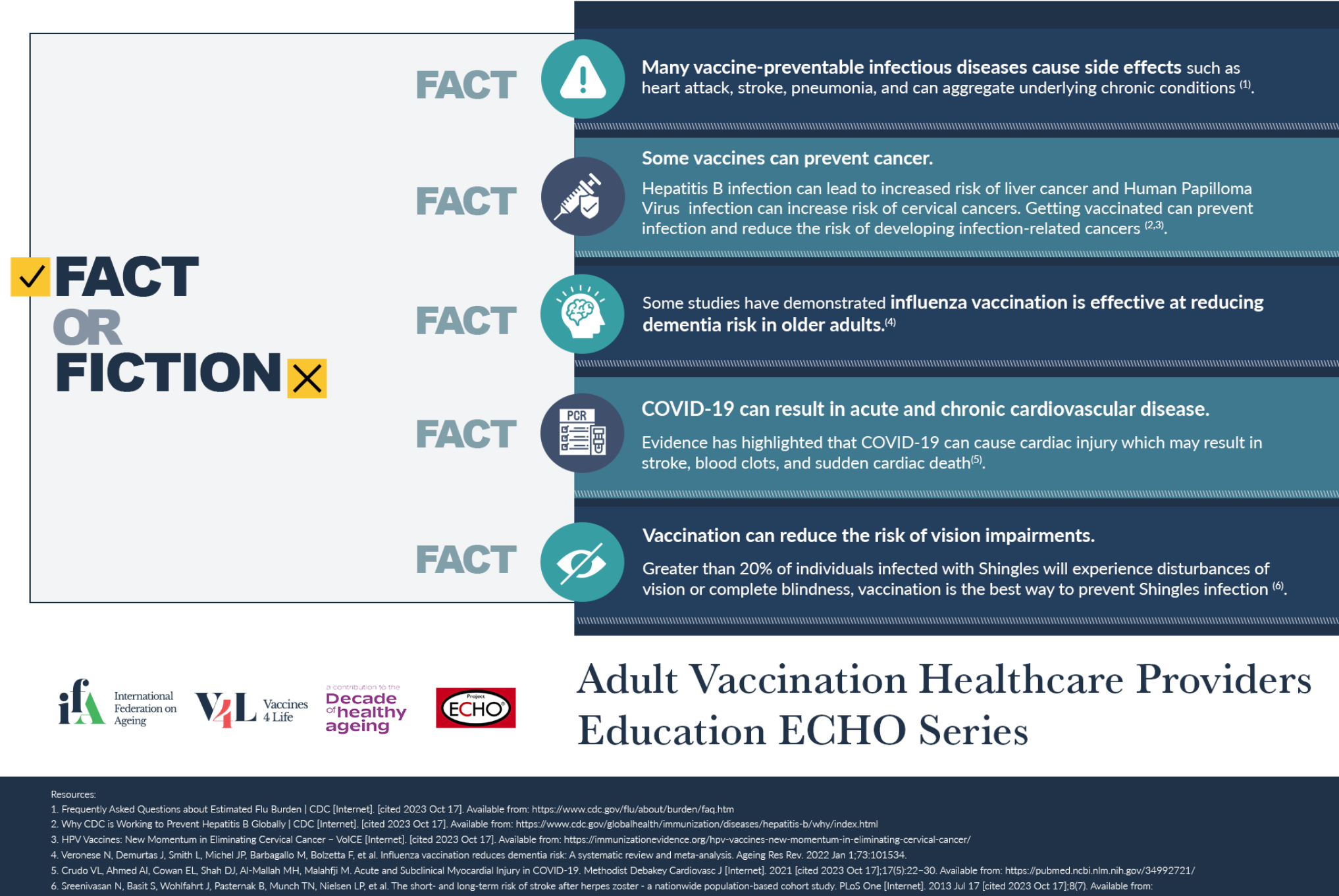 “The International Federation on Ageing (IFA) is proud to announce another instalment of the Adult Vaccination Healthcare Providers Education ECHO. The program – taking place biweekly from October 18-December 13 aims to strengthen healthcare provider skills and competencies to promote and advocate for adult immunization. Building on previous programming and experience, IFA will harness the ECHOTM Model and its proven method of learning for this innovative program to educate and inform diverse healthcare providers on the field of ageing and VPDs. The model allows for participatory dialogue and allows current and future healthcare providers the opportunity to seek recommendations directly from a panel of subject matter experts. For more information and to register, please visit the Vaccines for Life website.”